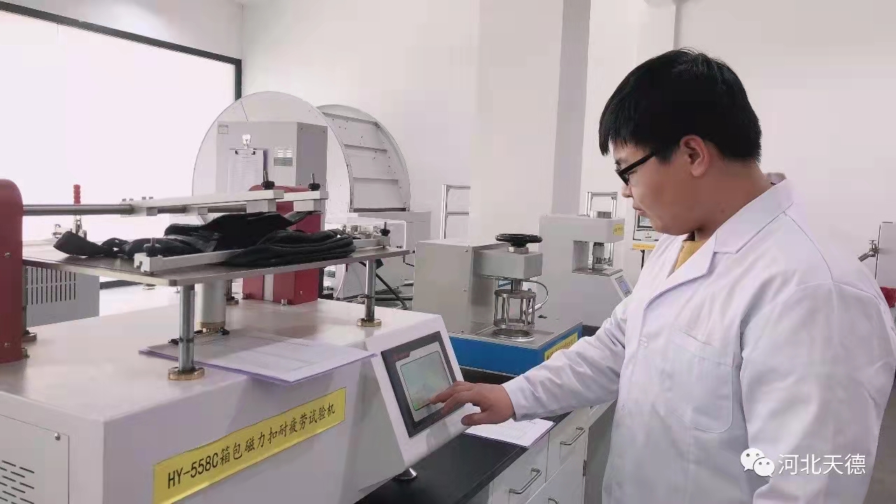 天德质量检测服务有限公司作为白沟唯一一家专业质检公司,始终致力于提升业务能力,优化服务水平,助力产业转型升级。针对箱包检测配备了物理实验室和化学实验室,检测服务项目已达200余项,可以提供全项的背提包、旅行箱包的项目检验。